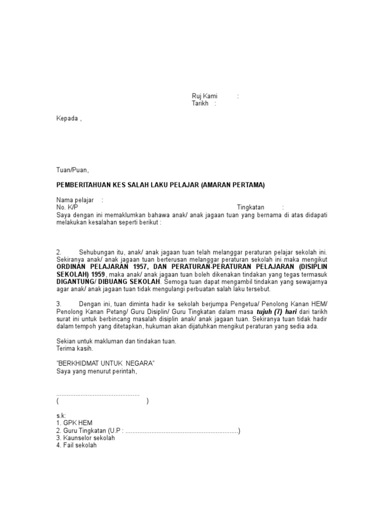 Surat amaran kepada penjaga murid. Surat ini adalah dirujuk kepada. Pasti Dilirik HRD.